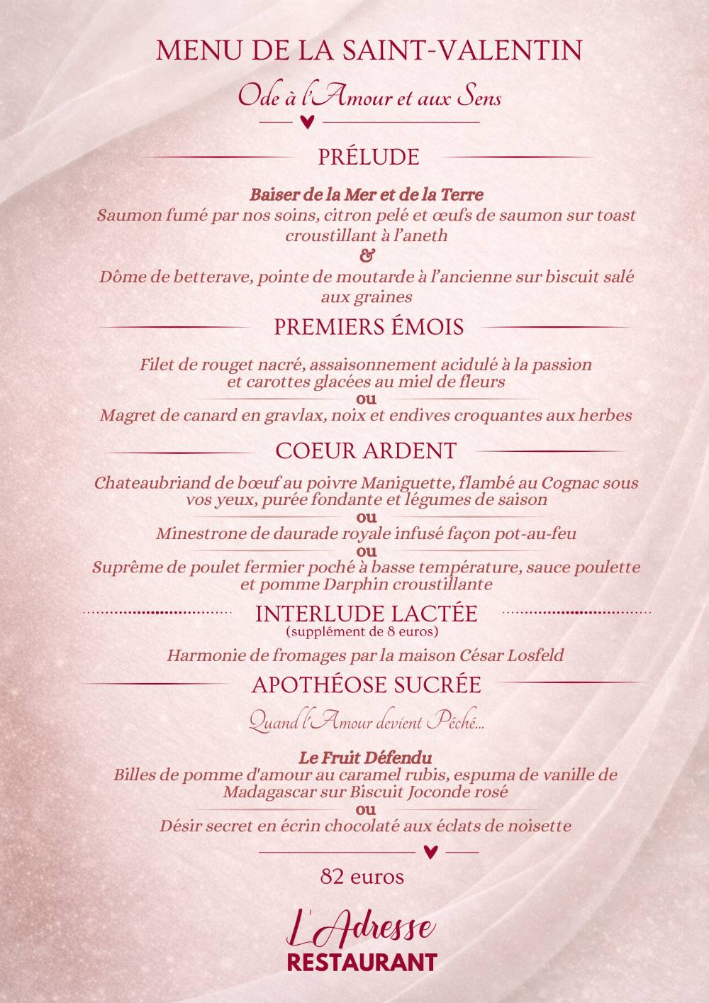 À l’occasion de la Saint-Valentin, le restaurant vous propose un menu spécial, spécialement conçu pour célébrer l’amour.